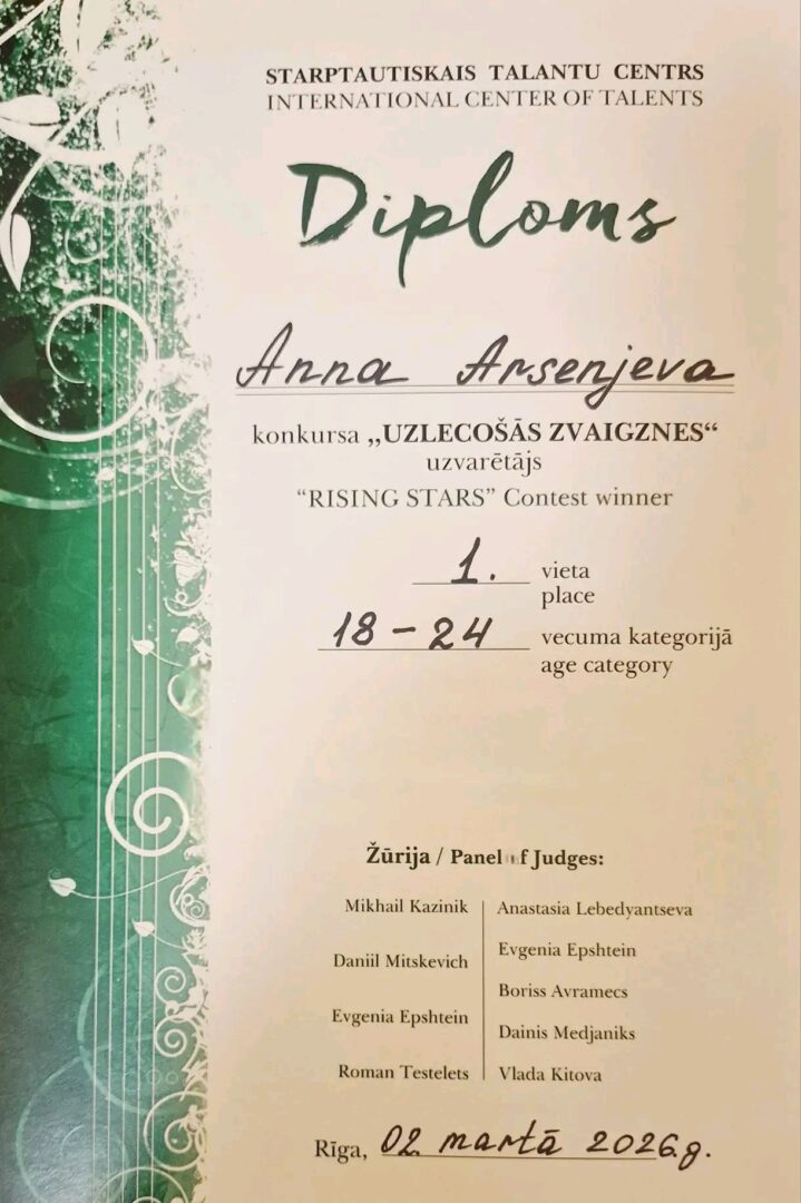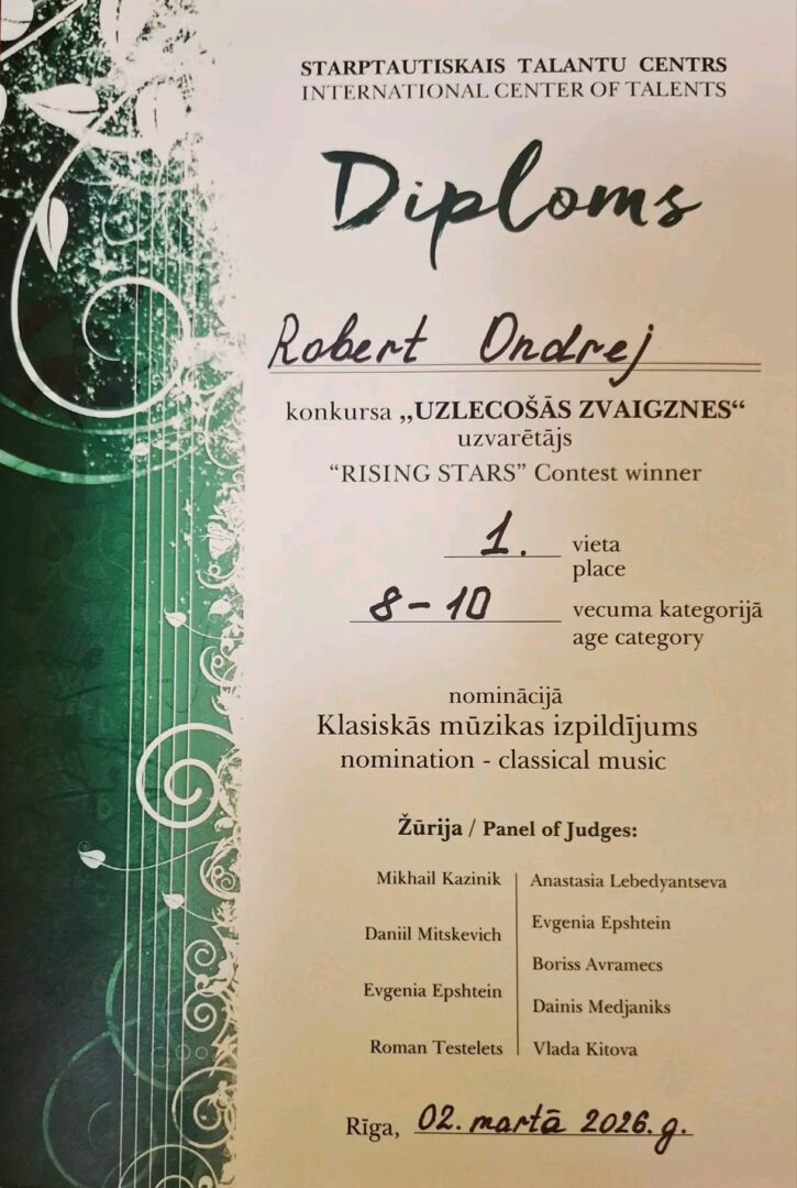 28.02-2.03 toimus Riias rahvusvaheline konkurss “Rising Stars – 2026”, kus Nõmmelt osalesid Vladimira Ljutova õpilased Robert Ondrej ja Anna Arsenjeva, kes kumbki pärjati omas vanusegrupis laureaadi tiitliga! Palju-palju õnne Robertile ja Annale ning nende õpetajale Vladimirale!! Soojas ja toetavas õhkkonnas toimunud konkurss lõppes galakontserdiga, kus esinesid laureaadid ning professionaalsed muusikud. Oli kaunis kevadhõnguline nädalalõpp Läti pealinnas.